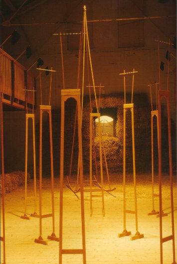 Installation (Hertel/Verhoeven), Gr. Pferd, 12 Hürden, "Arena" in Strohballen, Baldachin, Pferdeäpfel, Pegasus-Flügel, Tonbandschleife